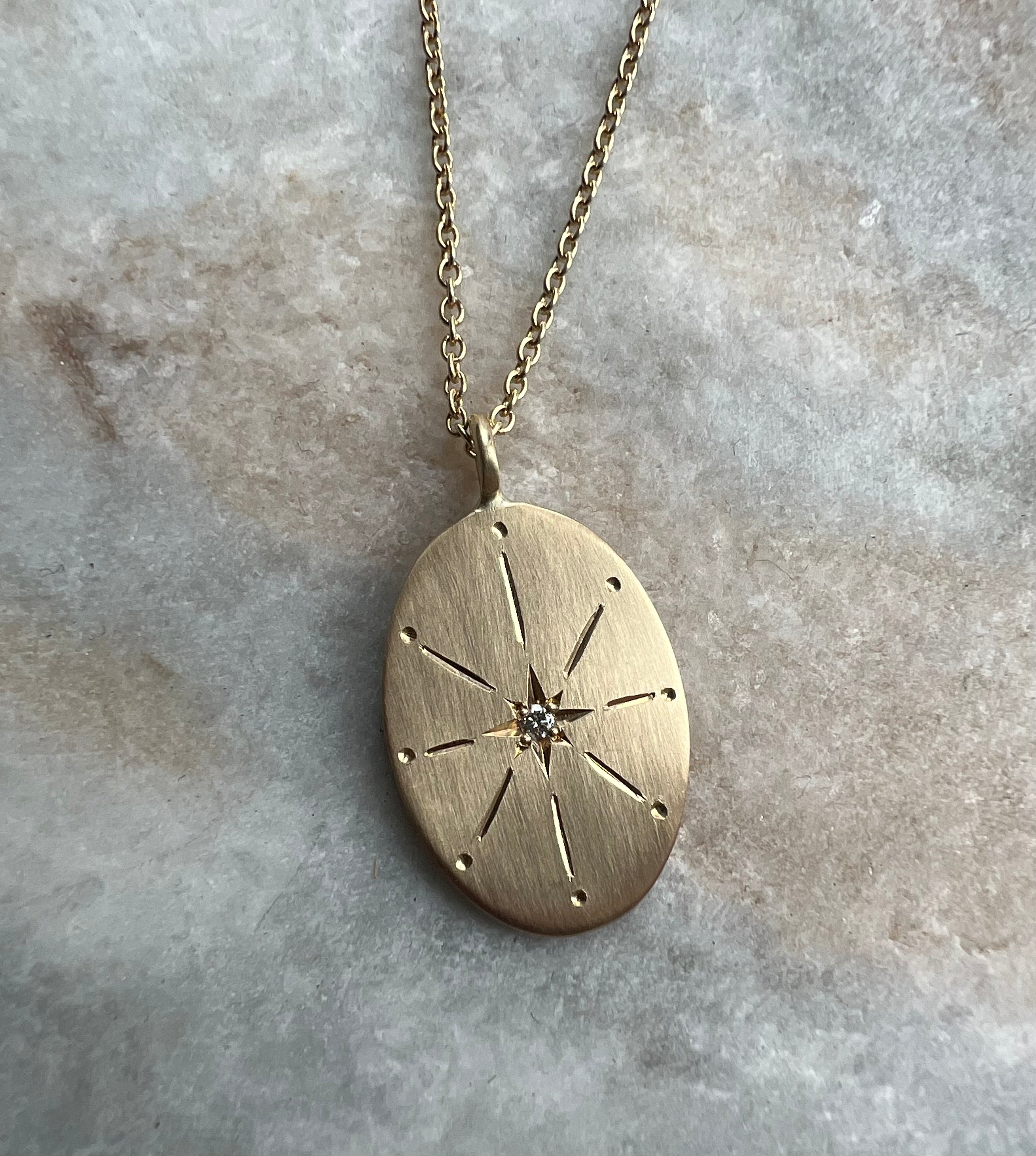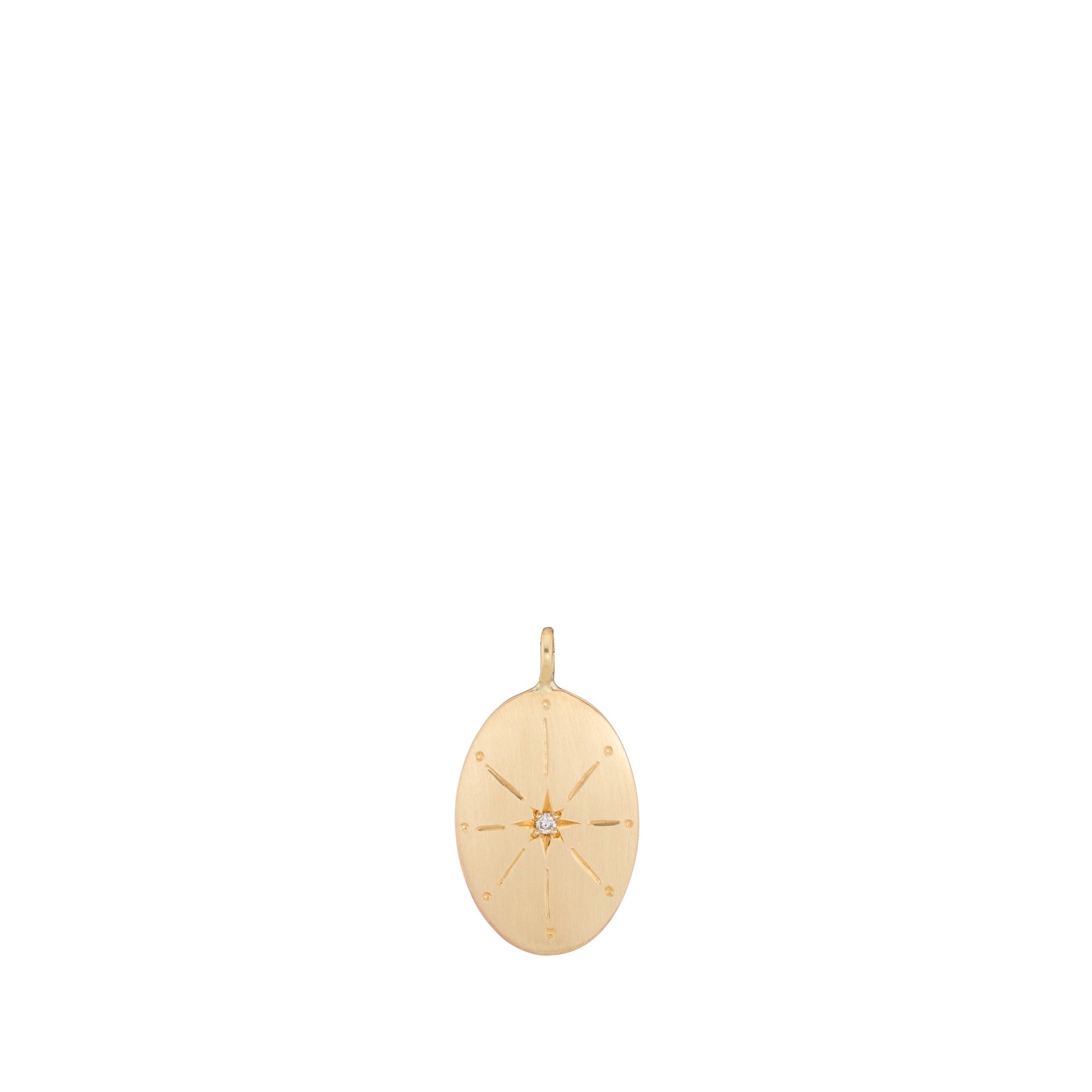 Cosmo - Gold Oval Disc Pendant with Star set Diamond and Engraved Sunburst